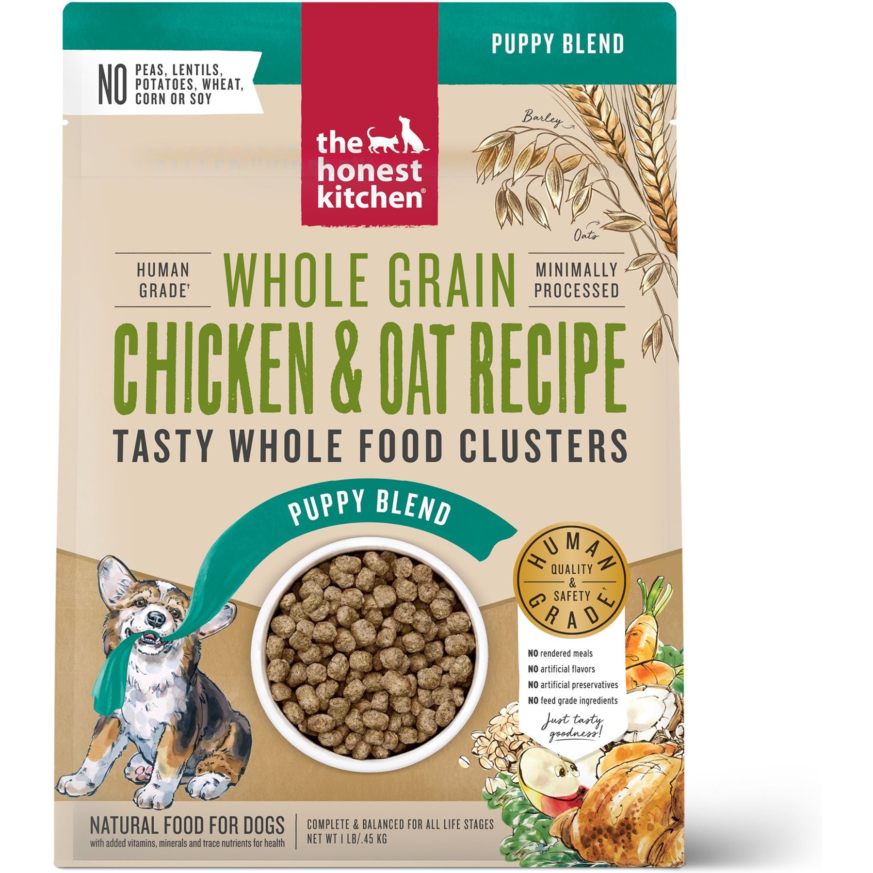 39 Ingredients: Chicken, oats, barley, chicken liver, carrots, eggs, ground flaxseed, broccoli, pumpkin, apples, natural chicken flavor, salmon oil, coconut oil, chia seed, kale, minerals [tricalcium phosphate, sodiu